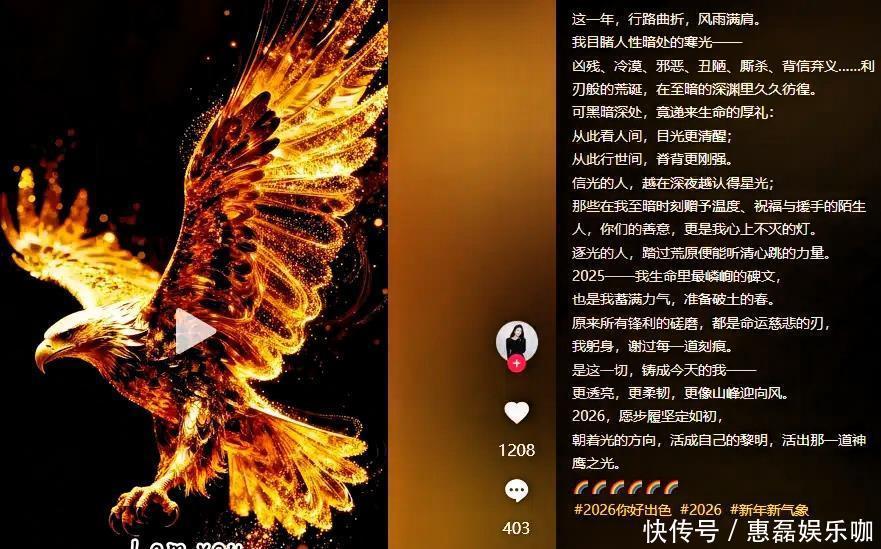 面对这些难听的话,杜星霖压根没理会,转头又发了一张金色雄鹰图,配了一大段鸡汤文感慨人生。她说过去这一年,见多了人性里的阴暗寒凉,也收获过陌生人的温暖善意,往后再看这人间,眼神会更清醒,往后再走人生路,腰杆会更挺拔。