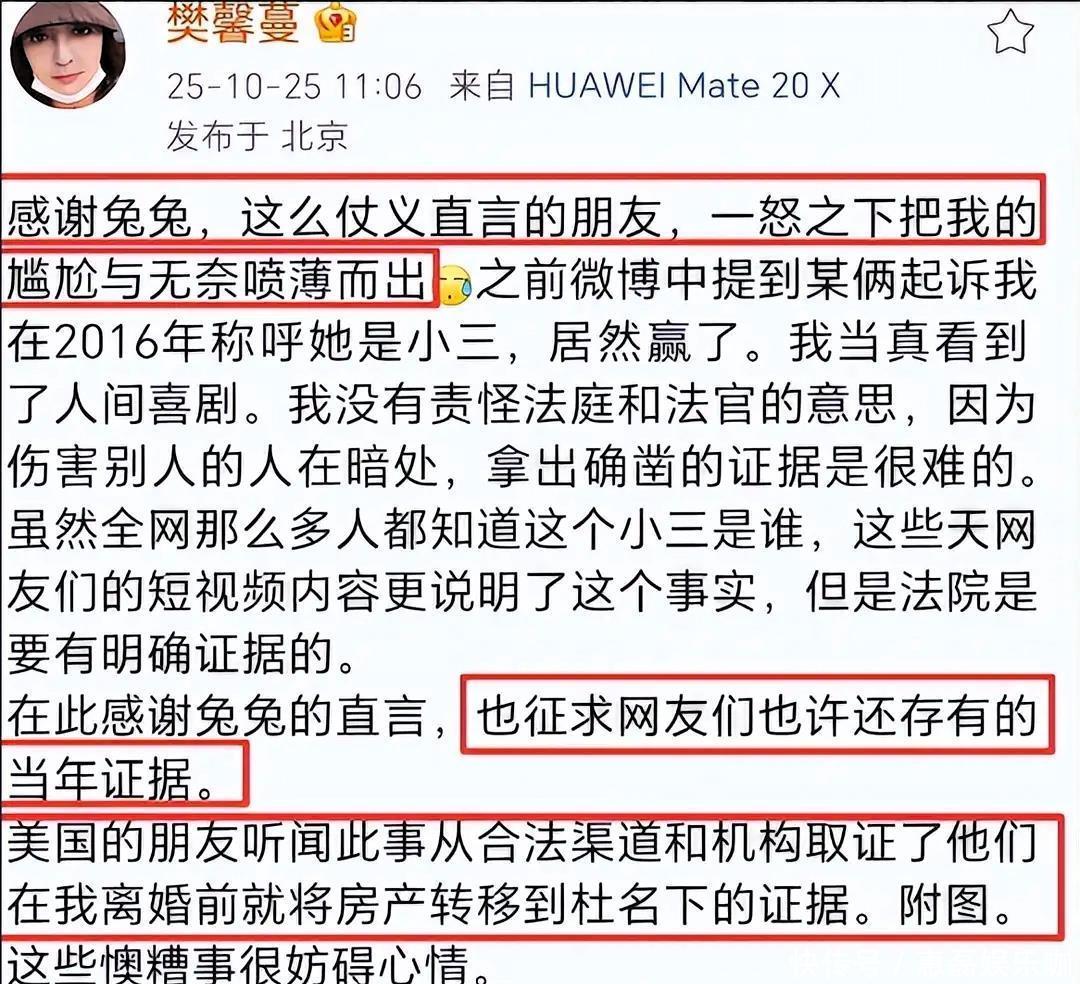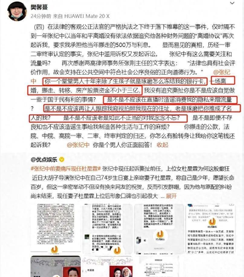 其实杜星霖之所以一直被大家诟病,根源还是在她和张纪中的这段婚姻上,这段感情从一开始就不被看好,甚至可以说来路不正。张纪中前妻樊馨蔓,不止一次在网上发文控诉,说张纪中婚内偷偷转移了至少3亿资产,两人还没离婚的时候,就把美国的房子转到了杜星霖名下。